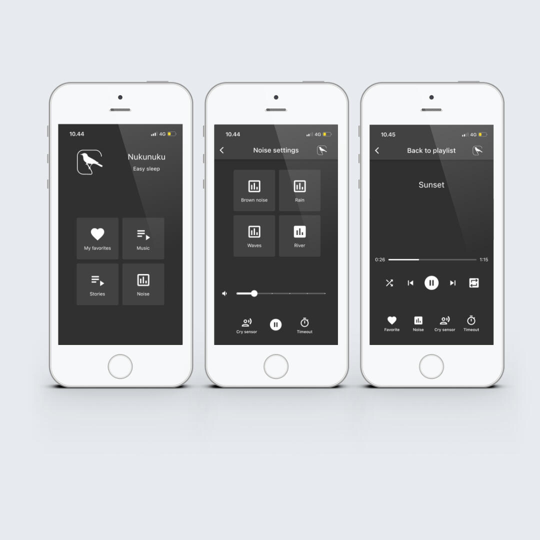 Nukunuku helps the child calm down through a combination of calming music, a noise machine and bedtime stories. It helps when they need to fall asleep, but it also shows them that they are capable of calming down - this has many benefits during the day too.